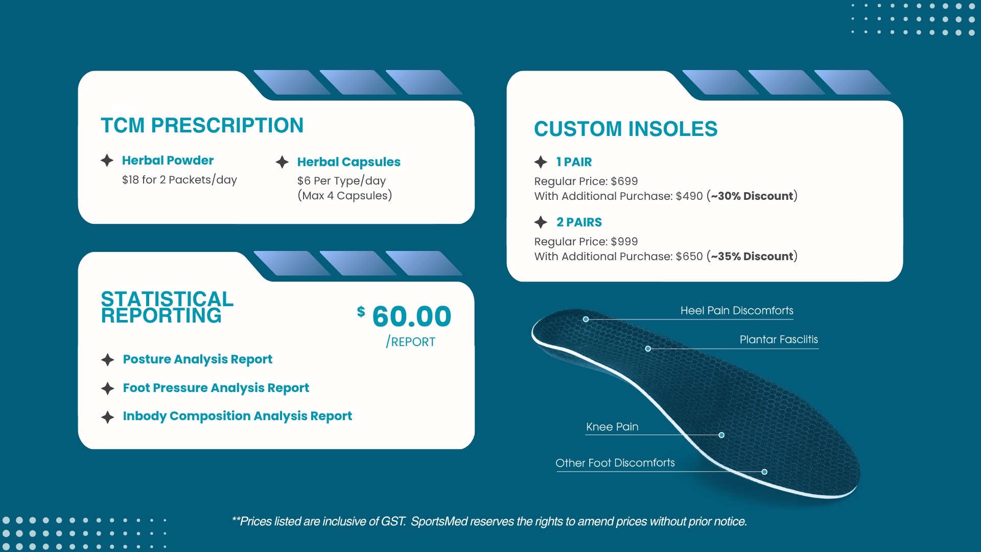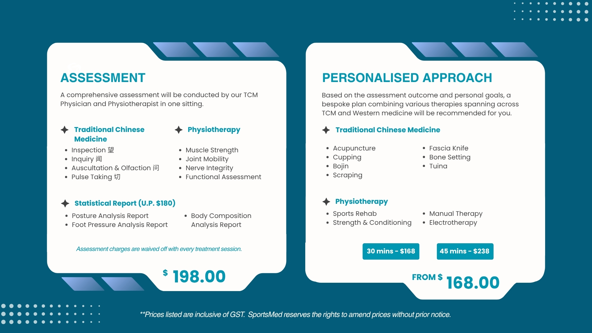 The number of sessions required varies depending on your condition and individual response to treatment. After your initial assessment, our physiotherapists and TCM physicians will provide a personalised treatment plan outlining the recommended number of sessions.